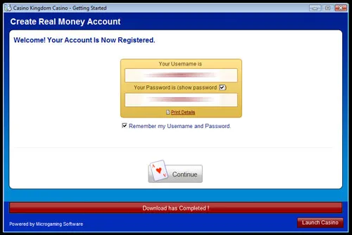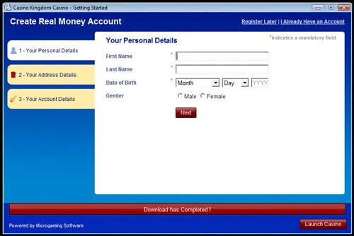 The Casino Kingdom software will now start to install. While the software downloads, you can register a real account or opt to use an existing account if you already have one.